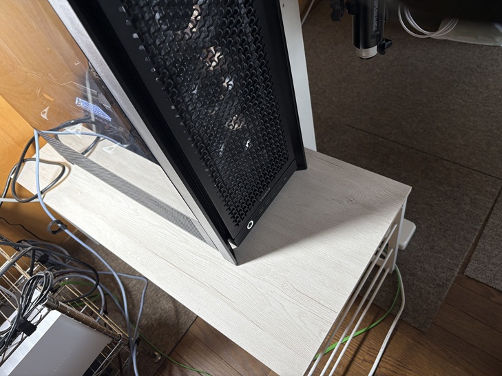 私も自作PCを趣味としており、組み立てたデスクトップパソコンをどこに置くか悩みに悩んでいます。悩み抜いた結果、現時点では、ローテーブルの上にパソコンを設置するのが、ベストだと考えています。
