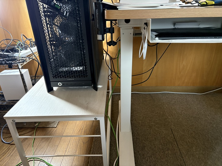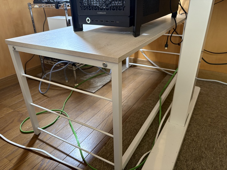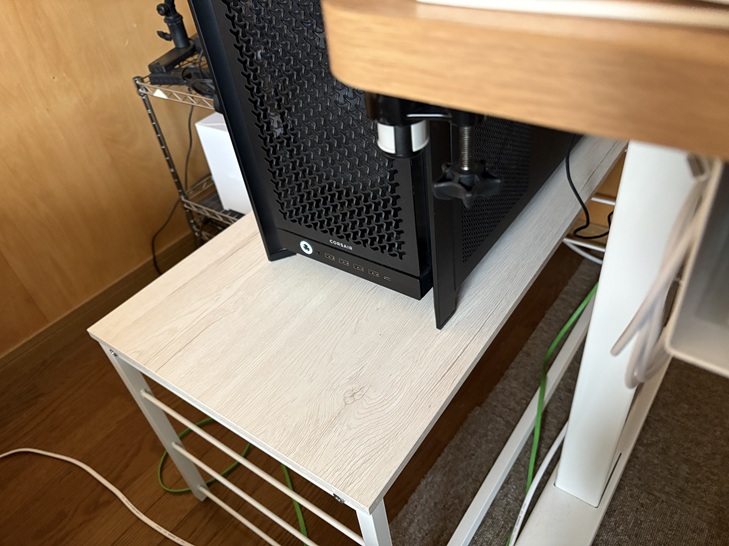 頑丈さの面で、不安感があるものの、机の上に設置するよりも低い位置にパソコンが置ける点や床設置時のホコリ問題を解決できているため、いったん良しとしています。