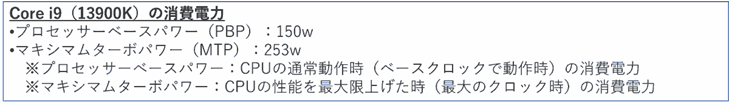 - CPU Intel Corei9(13900k)の消費電力:253w