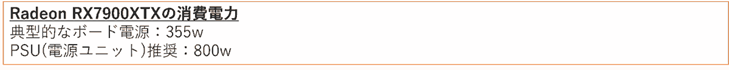 例として挙げている、Radeon RX7900XTXの消費電力を確認します。