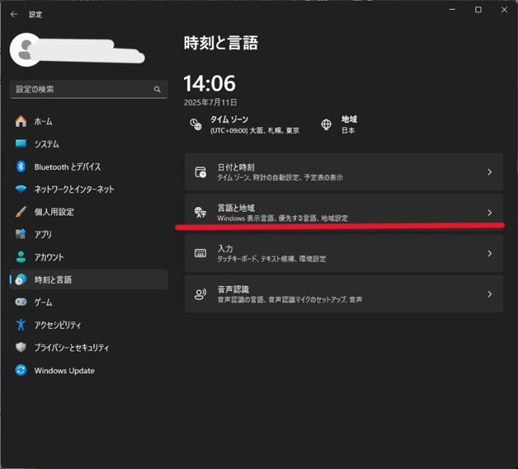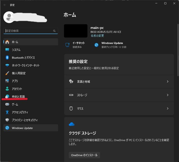 設定の左にあるメニューの一覧から、「時刻と言語」を選択します。