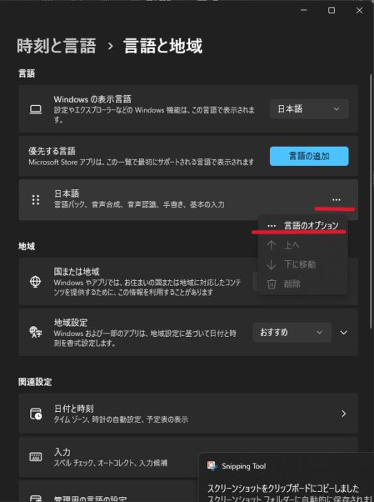 表示された画面で、「日本語」という項目があるので、3点リーダー(…)を選択します。