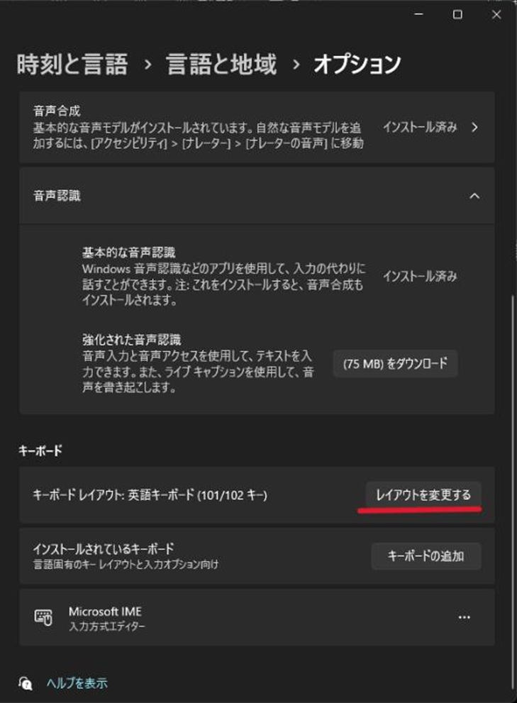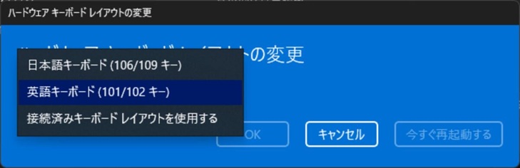 「キーボードレイアウト」の後には、現在設定しているキーボード設定が表示されています。